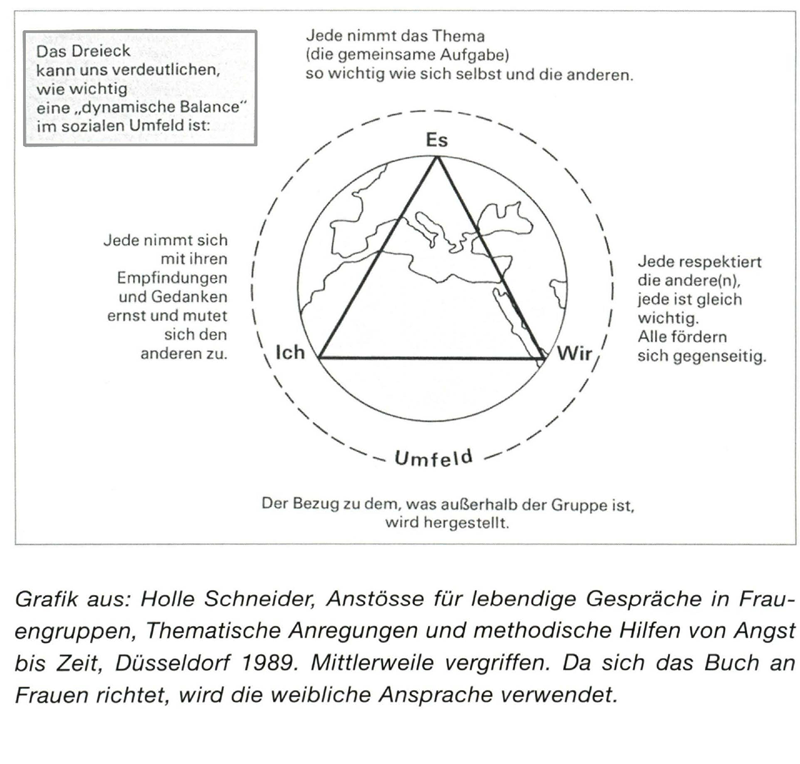 Zum anderen das „WIR“ im Sinne der Gruppennormen, des Umgangs miteinander, der Beziehungen zueinander: Wie wir miteinander kommunizieren und was wir dabei erleben. Wir respektieren uns, wir gehen wertschätzend miteinander um. Wir reden von unseren eigenen Erfahrungen. Wir werten den anderen nicht ab.